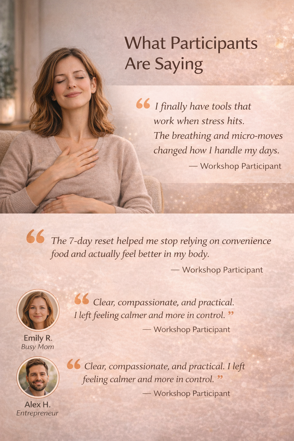 “I finally have tools that work when stress hits. The breathing and micro-moves changed how I handle my days.”